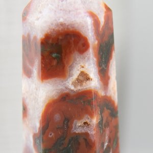 This Carnelian Moss Agate Tower is a captivating blend of vibrant red agate and beautiful patterns of red moss agate. This stunning crystal tower combines the fiery energy of carnelian with the earthy allure of moss agate, resulting in a unique and captivating piece that will delight crystal enthusiasts and collectors alike.