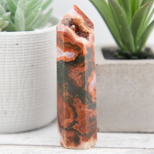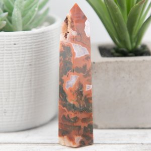 Crafted with meticulous attention to detail, this tower showcases the rich and deep red tones of carnelian interwoven with the intricate moss-like patterns of red moss agate. The fusion of these two crystals creates a harmonious blend of energies, combining the fiery passion and vitality of Carnelian with the grounding and nurturing qualities of moss agate.