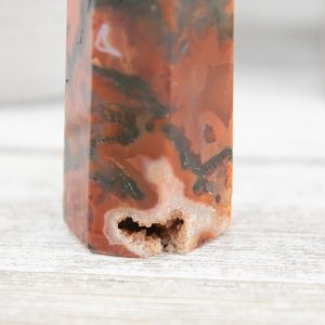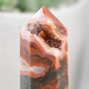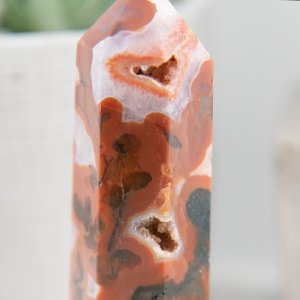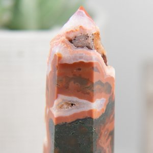 This Carnelian Moss Agate Tower is a captivating blend of vibrant red agate and beautiful patterns of red moss agate. This stunning crystal tower combines the fiery energy of carnelian with the earthy allure of moss agate, resulting in a unique and captivating piece that will delight crystal enthusiasts and collectors alike.