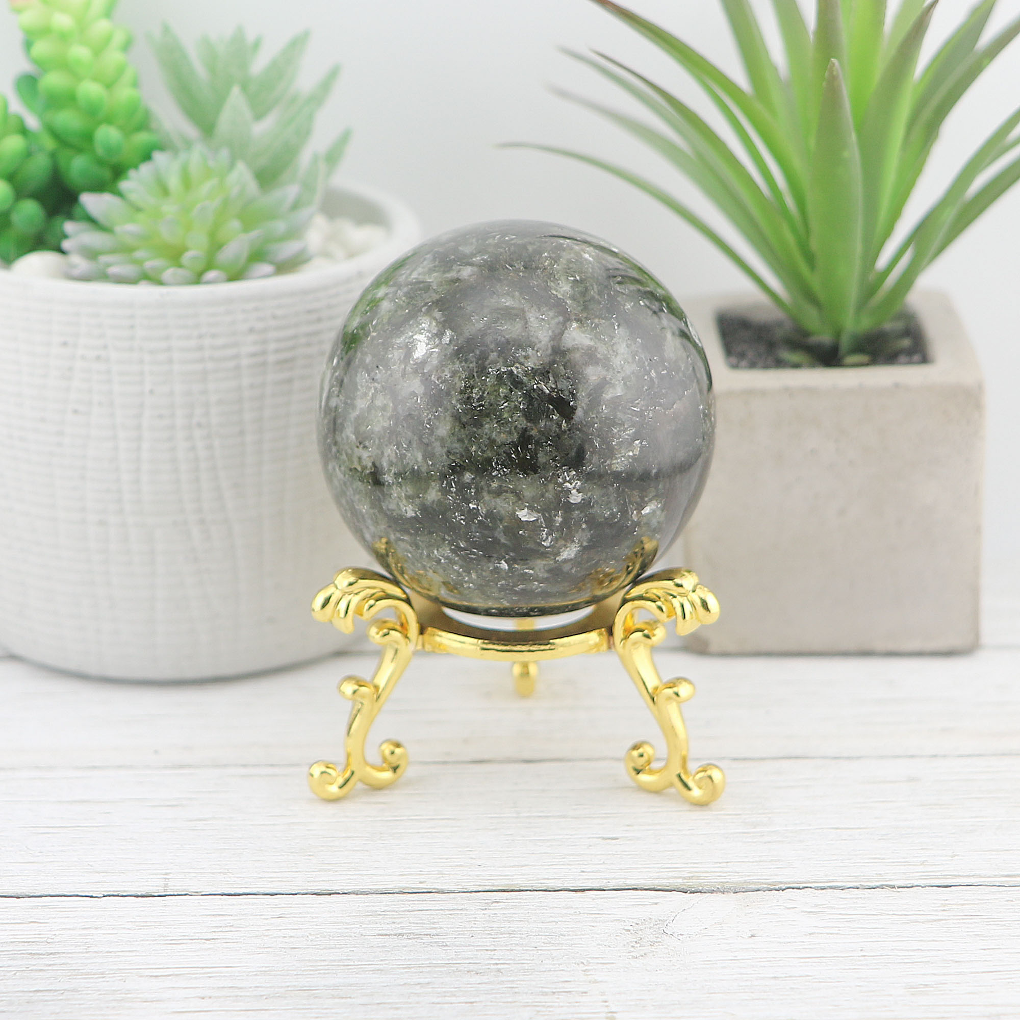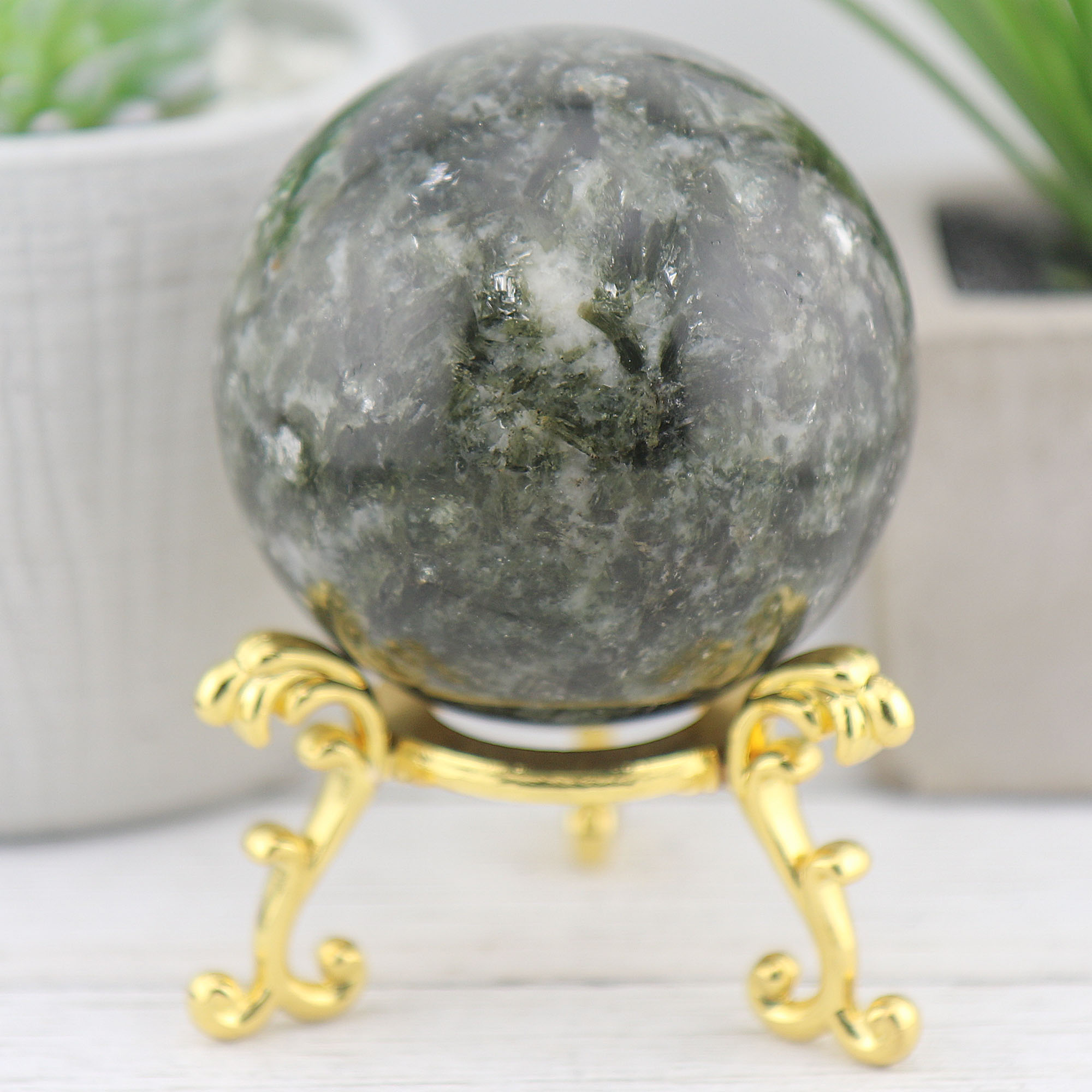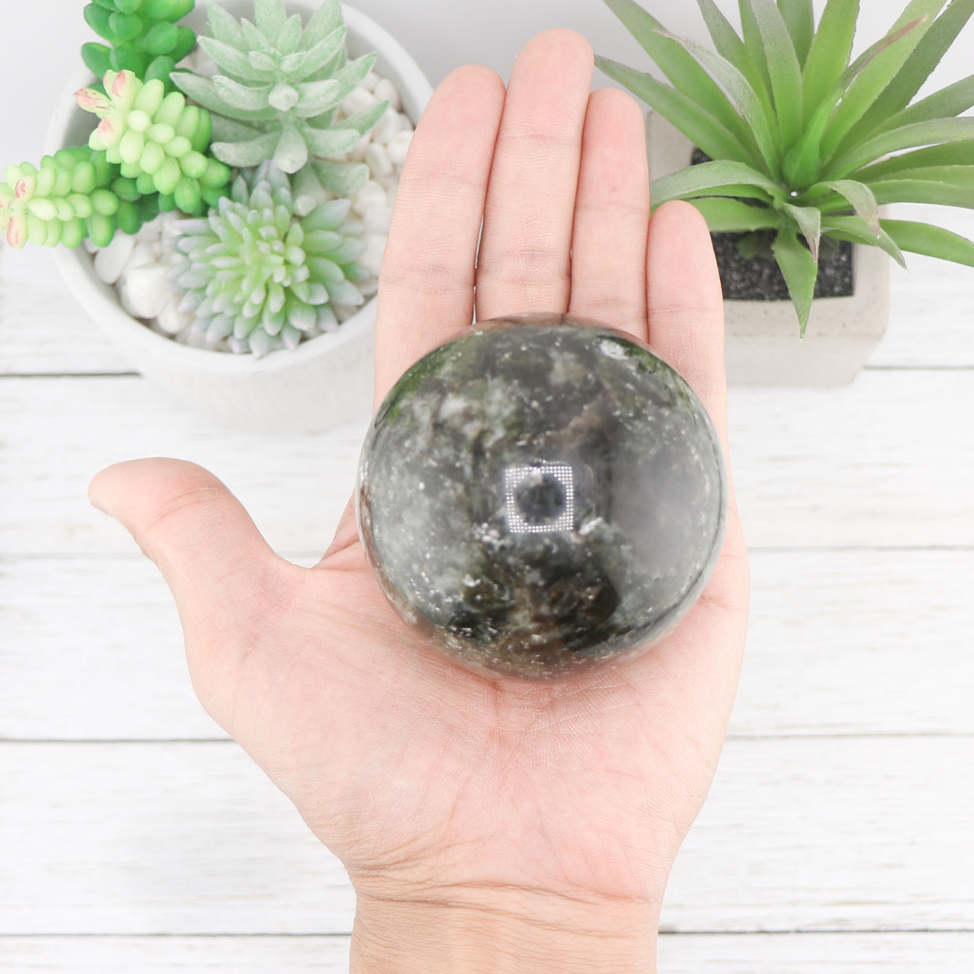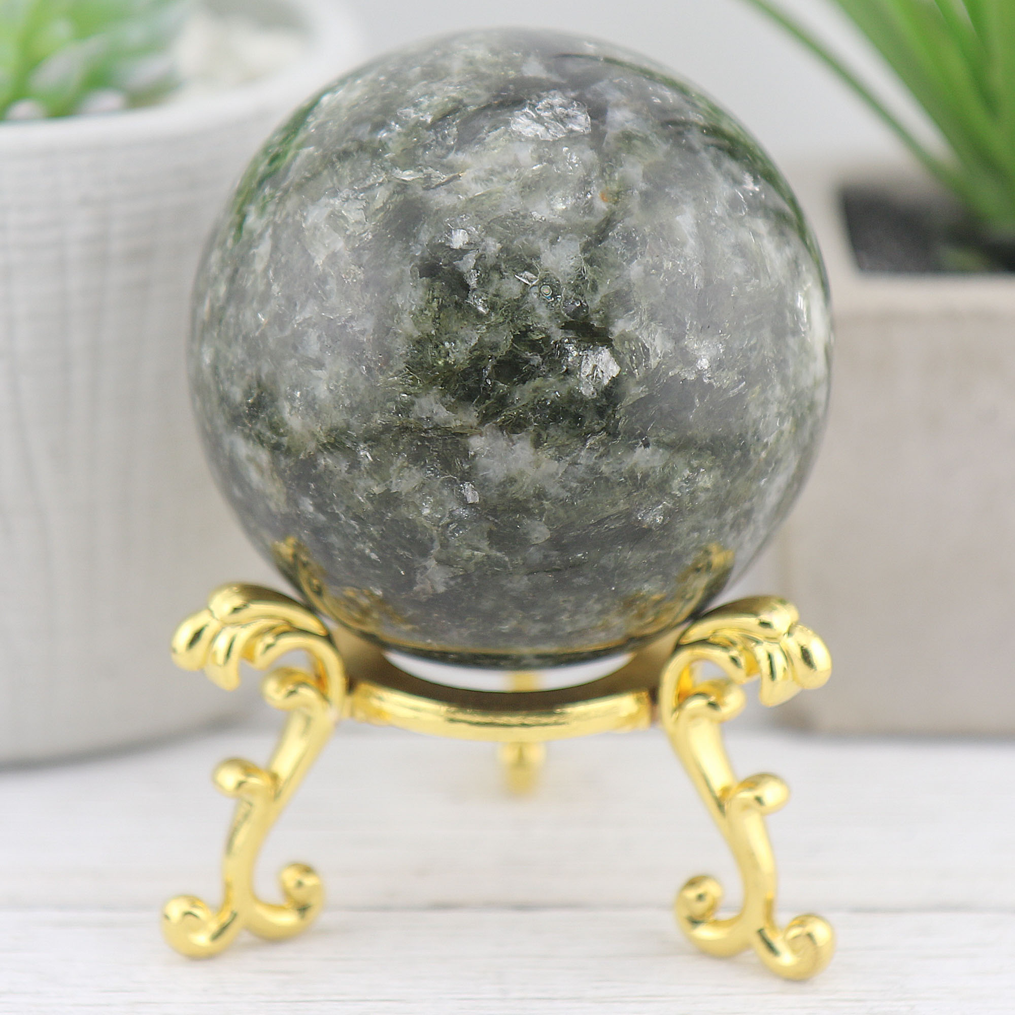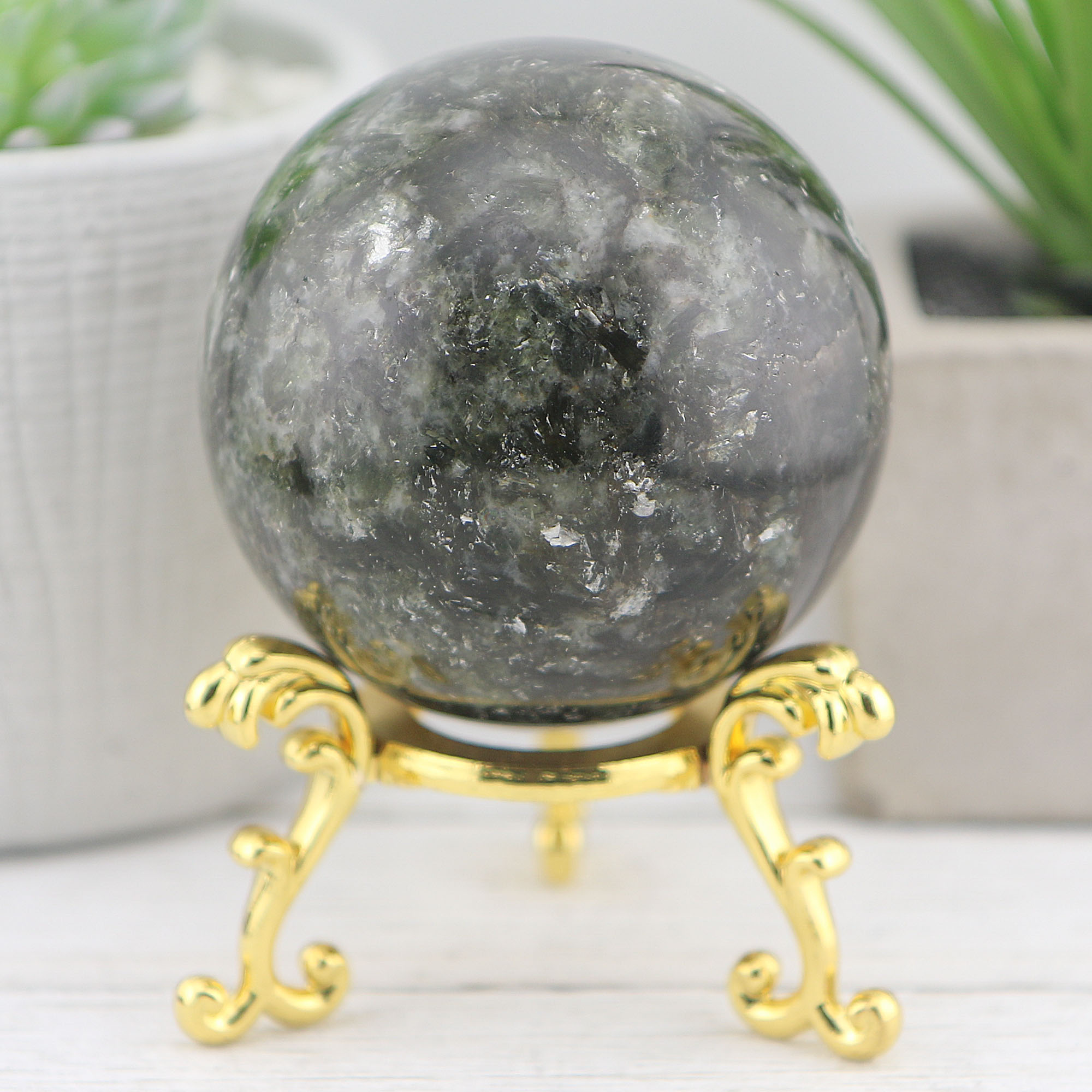 Discover the unique beauty and transformative energy of our Green Mica Sphere, a captivating gemstone piece that brings serenity, protection, and spiritual growth into your life. Perfect for crystal enthusiasts and collectors alike, this sphere is a must-have addition to any space.