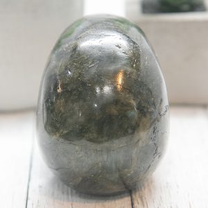 The skull’s surface is adorned with the mesmerizing “labradorescence” of the stone, which displays various colors, including blue, green, yellow, and orange. The effect is enhanced by the polished surface of the skull, making it a stunning display piece.