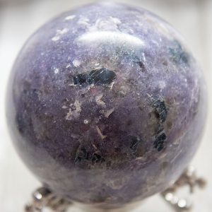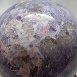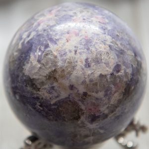 This rare and beautiful Unicorn Stone Sphere is a stunning and unique crystal specimen from Madagascar. This high-quality piece is made from natural Lepidolite, Pink Tourmaline, Smokey Quartz, and Clevelandite, all found in the same pegmatite.