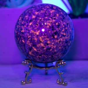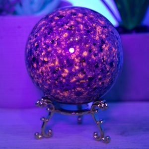 The Yooperlite sphere is made from natural emberlite that has been hand-selected for its high quality and beauty. This gemstone is UV reactive, which glows under blacklight, adding extra excitement to this piece.