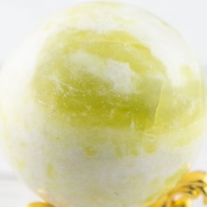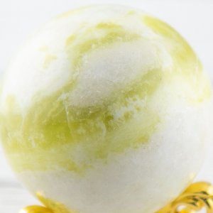 This stunning Lemon Jade Sphere is a natural gemstone masterpiece with vibrant green and white hues. This exquisite sphere is crafted from genuine jadeite, a serpentine jade that showcases the beauty and elegance of natural crystal formations.