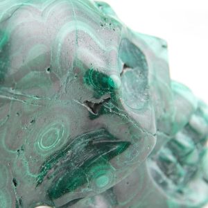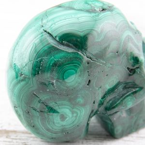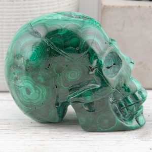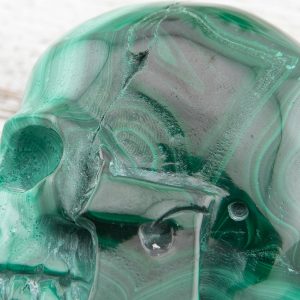 This stunning natural malachite skull is a one-of-a-kind addition to any collection. Its rough, natural surface adds to its rustic charm and makes it a unique piece.