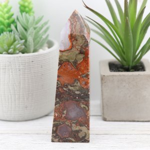 Elevate your space with the dynamic and prosperous energy of our Money Agate Tower. This exquisite piece, featuring vibrant hues of orange, green, and brown, along with captivating druzy formations and brecciated patterns, is perfect for those seeking both aesthetic beauty and abundance.