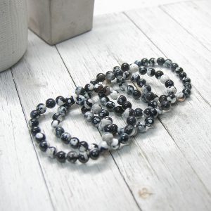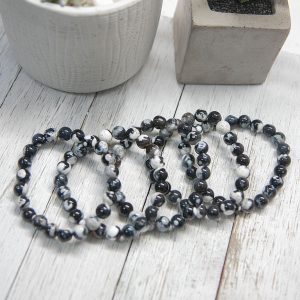 This Orca Agate bracelet is a one-of-a-kind accessory that is perfect for anyone who loves crystals and the natural world. Made from high-quality, natural Orca Agate from Madagascar, this bracelet is a true testament to the beauty and power of Mother Nature. Orca Agate is a type of crystal known for its unique black-and-white striped pattern, which is said to resemble the markings of a killer whale. This bracelet features multiple Orca Agate beads strung together on a durable, stretchy cord, creating a stylish and comfortable bracelet. The elastic band of this bracelet makes it suitable for any wrist. Whether you’re looking for a gift for a loved one or want to treat yourself, this Orca Agate bracelet will bring a touch of natural beauty to your daily wardrobe.