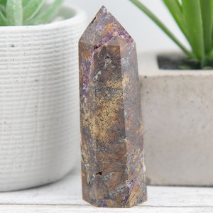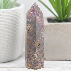 This Purple Brecciated Jasper Tower is a stunning natural gemstone tower that combines shades of green and purple. This captivating crystal tower showcases the unique fusion of brecciated jasper with opalized fluorite, creating a mesmerizing display of colors and patterns.