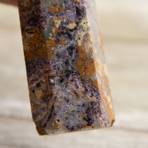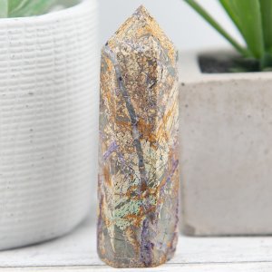 This Purple Brecciated Jasper Tower is a stunning natural gemstone tower that combines shades of green and purple. This captivating crystal tower showcases the unique fusion of brecciated jasper with opalized fluorite, creating a mesmerizing display of colors and patterns.