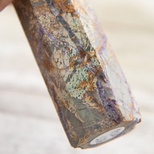 Opalized fluorite, with its iridescent colors and druzy, enhances the vibrancy of this tower. It adds an element of magic and spiritual insight, stimulating intuition and connecting you with higher realms. This combination of green and purple hues creates a harmonious blend of energies, fostering a sense of peace, harmony, and spiritual awakening.