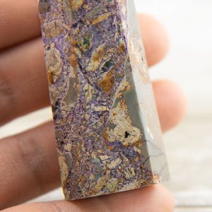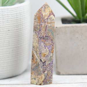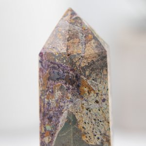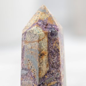 This Purple Brecciated Jasper Tower is a stunning natural gemstone tower that combines shades of green and purple. This captivating crystal tower showcases the unique fusion of brecciated jasper with opalized fluorite, creating a mesmerizing display of colors and patterns.