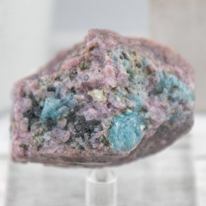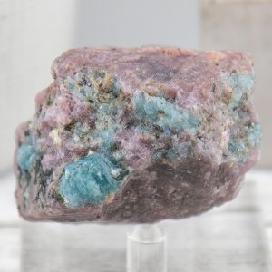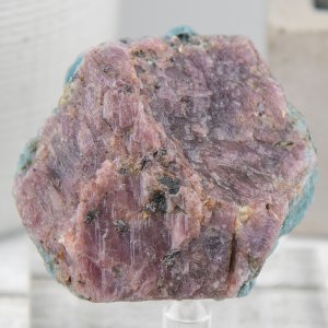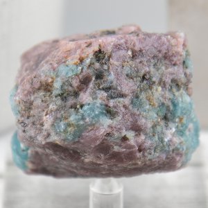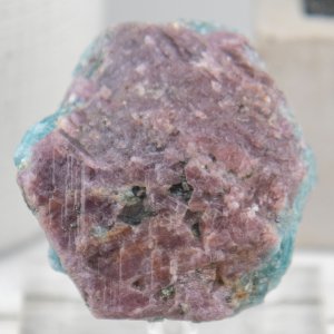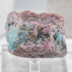 This rough stone is a natural and unique piece from India, known for its high quality and variety of corundum. It features a beautiful combination of ruby and sapphire, both of which are varieties of corundum. The ruby is a rich red color, while the sapphire is a stunning shade of aquamarine blue.