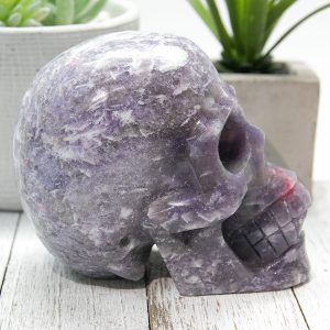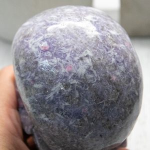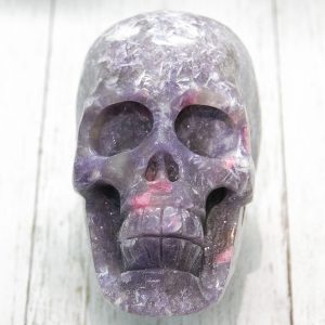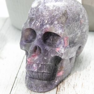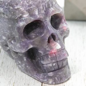 This rough Unicorn Stone Skull is a natural and untreated specimen, showcasing the crystals’ stunning colors and unique patterns. The Lepidolite and Clevelandite give the skull a beautiful purple hue, while the Pink Tourmaline and Smokey Quartz add pops of pink and grey.