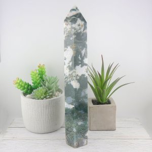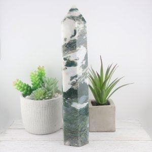 Transform your space with the captivating and harmonious energy of our extra-large Moss Agate Druzy Tower. This remarkable piece, with its natural moss-like patterns and sparkling druzy formations, is perfect for those seeking both aesthetic beauty and grounding energy.